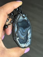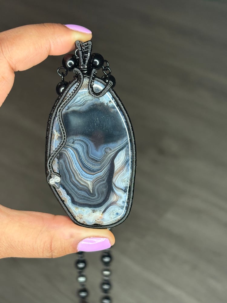 Black banded agate pendant on an 18 inch obsidian & hematite beaded chain β¨ all wrapped in black coated copper