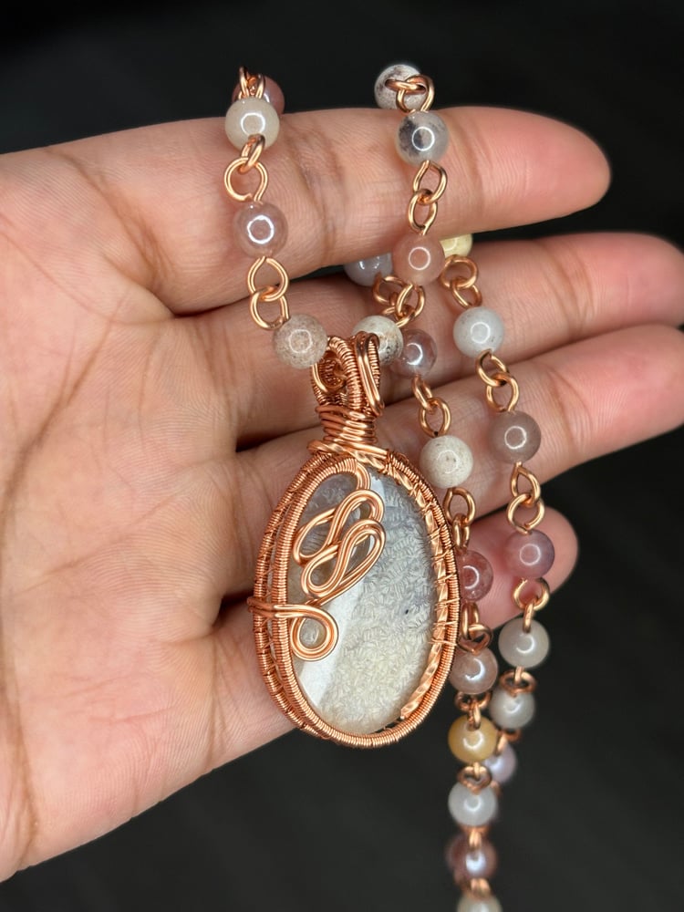 Fossil coral pendant on a 16 inch sunstone beaded chain ✨ all wrapped in clear coated copper.