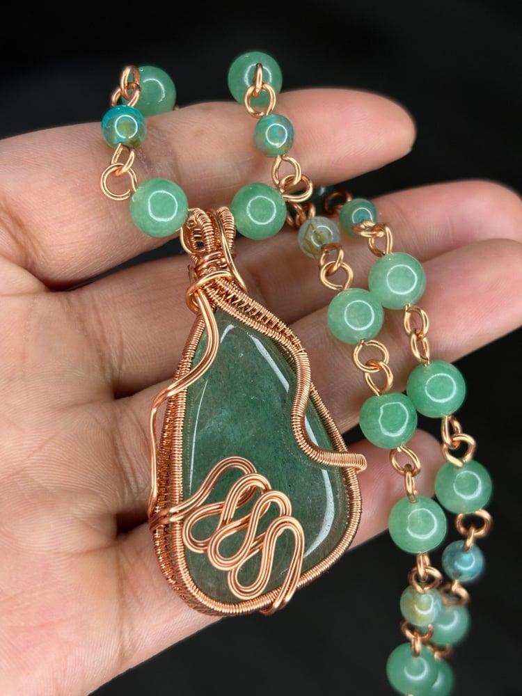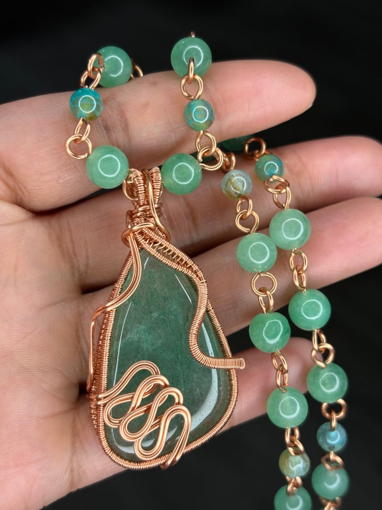 Green aventurine pendant on an 18 inch green aventurine & crackle agate beaded chain ⨠all wrapped in clear coated copper.